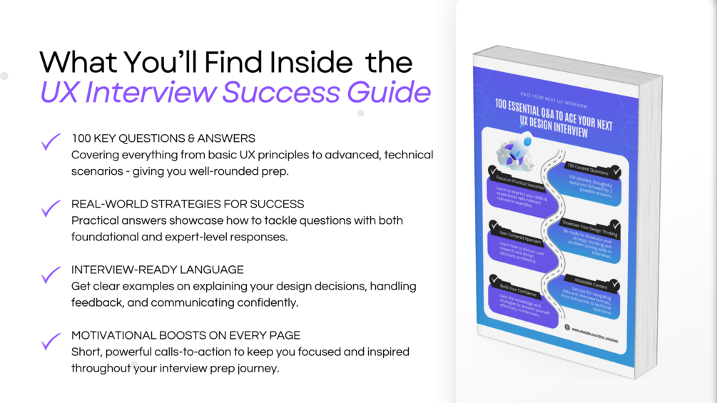 To help you succeed, I’ve created a comprehensive guide with 100 essential interview questions tailored specifically for UX/UI and Product Designer roles. Each question comes with detailed answers, preparing you to showcase your skills, problem-solving abilities, and collaborative approach.